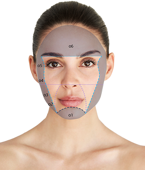 Dividimos o rosto em três zonas funcionais, cada uma com características e padrões de envelhecimento distintos. Essa divisão nos permite aplicar técnicas precisas e selecionar produtos adequados para resultados ideais e naturais.